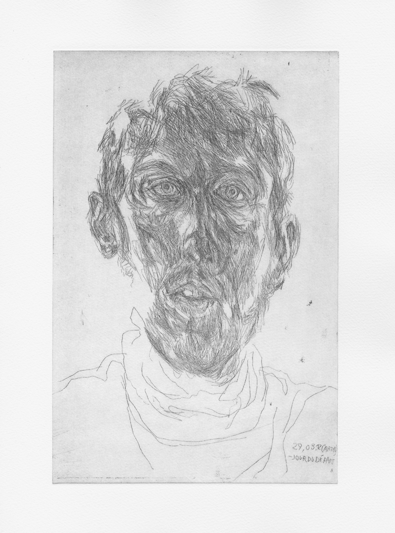 During a year, a self-portrait is drawn every day, by etching an aluminium plate.