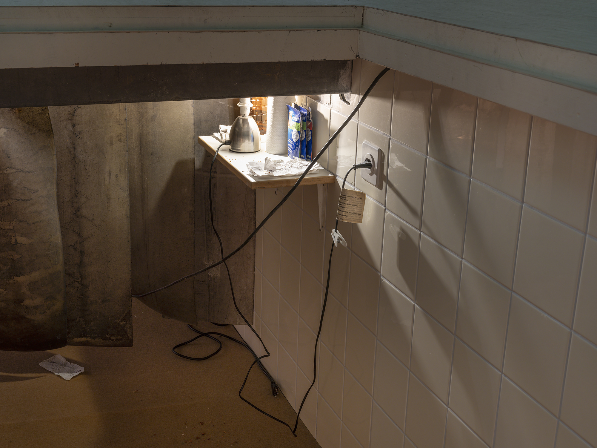 Linoleum, plexiglas, base boards and wall electrical outlets; 3D renders and basement stuff; custom wardrobe; furniture back plate, push-pins and paper; blankets; chimney, wall filler and wall paint; sink on wheels; hangers with flowers; stone wool; chair and pen.