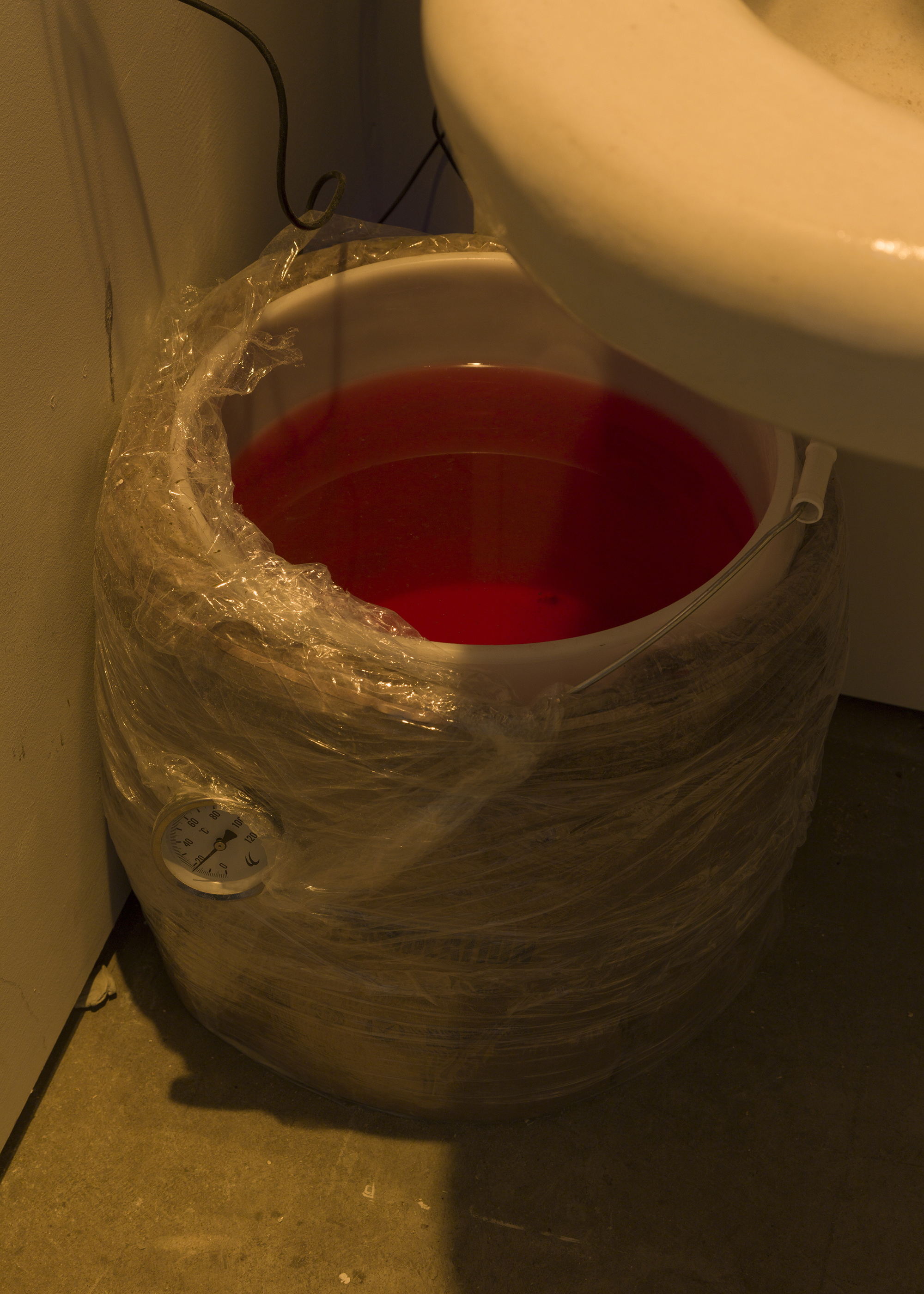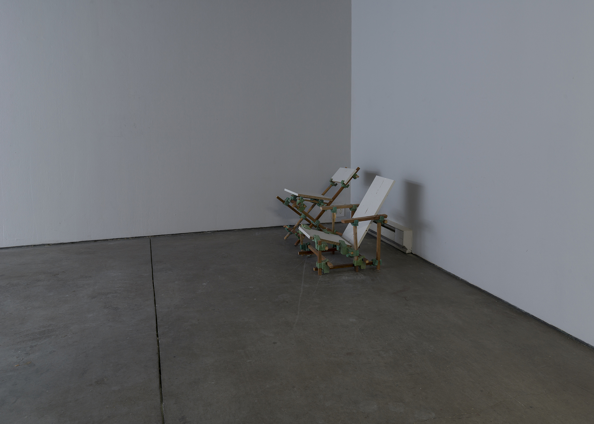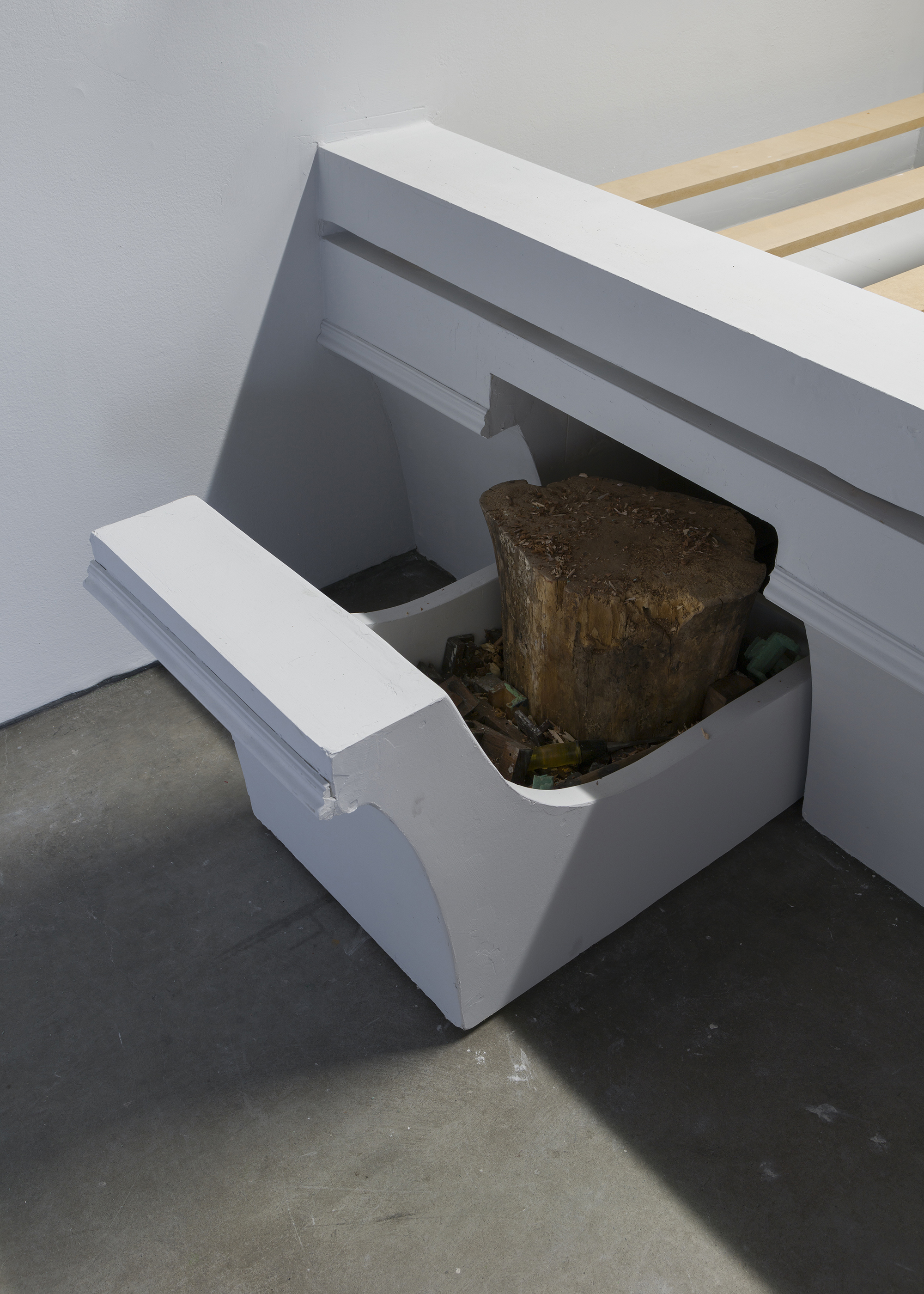 Vacuum lamp; bed-bath furniture; Rietveld and folding chair found wood facsimiles; drawer; cast urethane fittings; carved hardwood molds; tree stump; boiler room with homelab, ceramic sink, ethylene glycol, and bucket; empty phone.